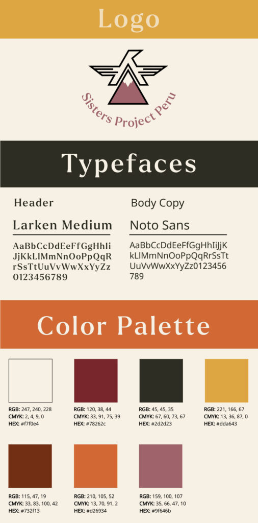 This project is for non-profit that is raising money to build a health clinic in Huacahuasi, Peru. The goal was to create something that stood apart from every other non-profit doing work in Peru (llamas in the logo). The Condor was something that really resonated with the Sacred Valley and is a symbol of power, strength, and endurance which represents this small community. The colors were chosen from colors we also found in this while visiting and really wanted to go with something calm that would work well on their website. Their larger donors will likely be people with more money than young people have, so it needed to feel strong while not being too masculine or feminine.